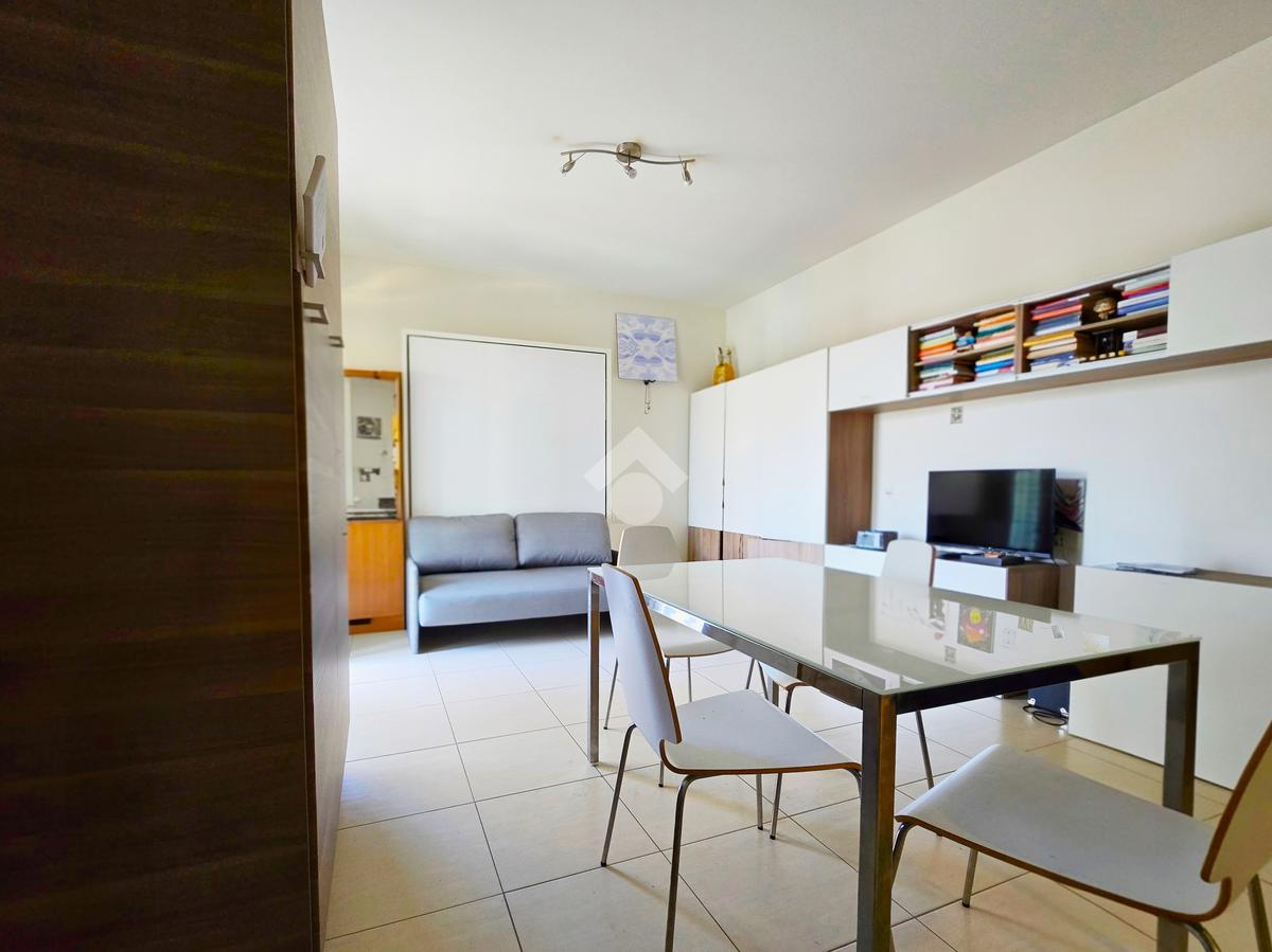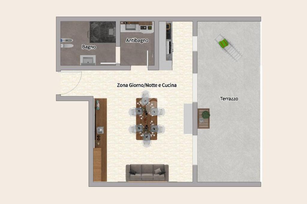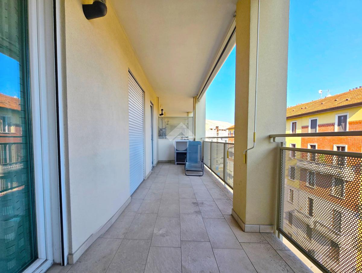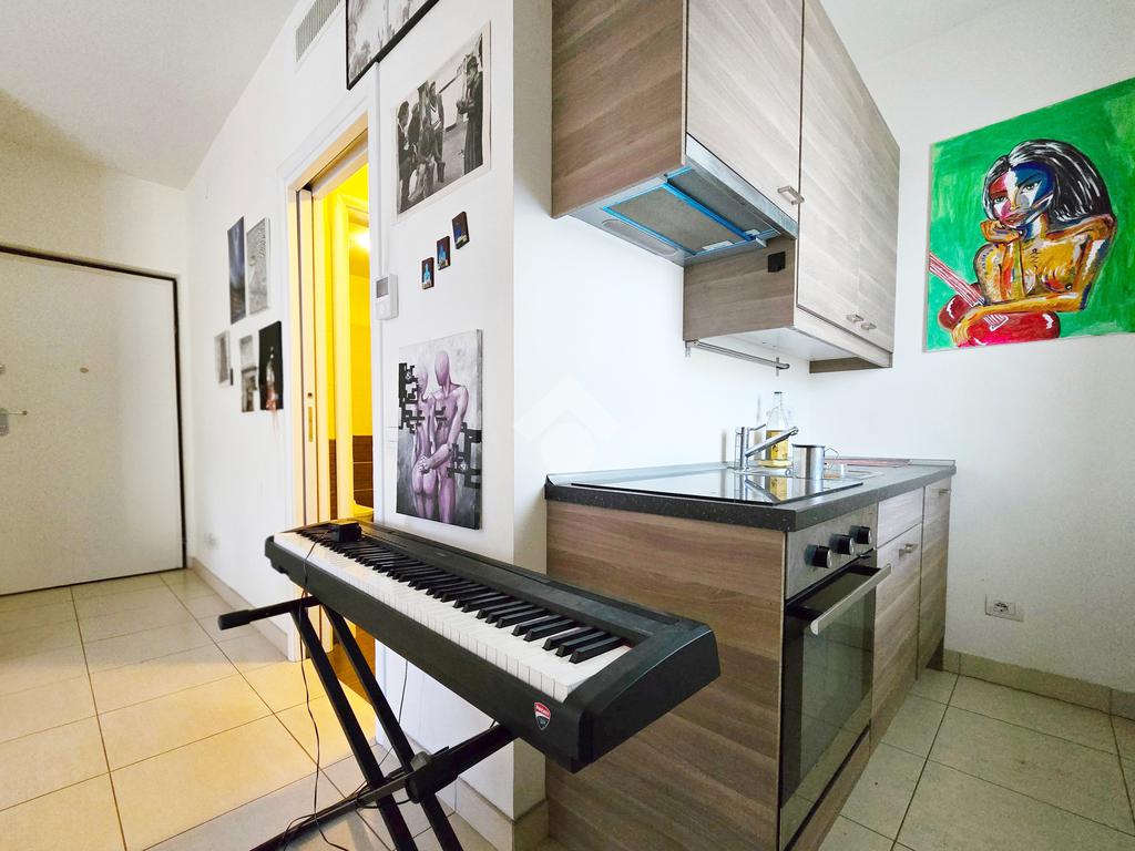 In stabile di recente costruzione del 2012, con ascensore, giardino condominiale, videocitofono e portineria mezza giornata, proponiamo in locazione al 4° piano, ampio monolocale di 45mq, così composto: Ingresso, Zona Giorno/Notte con Cucina a vista, Antibagno, Bagno cieco con doccia e Terrazzo di 15mq.